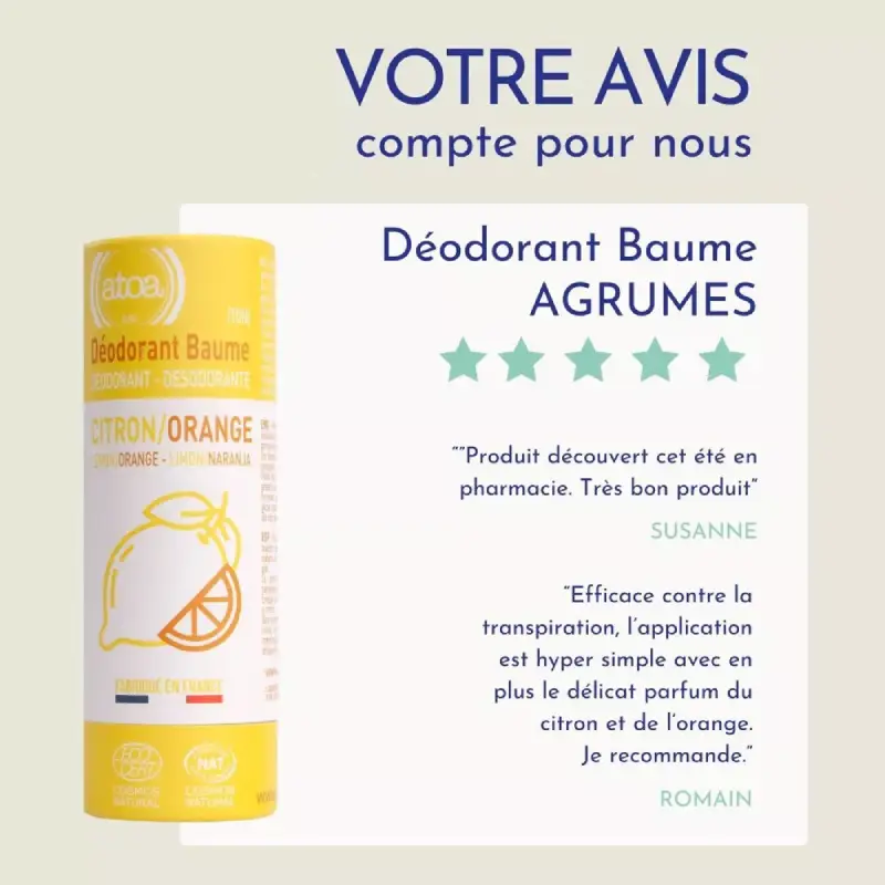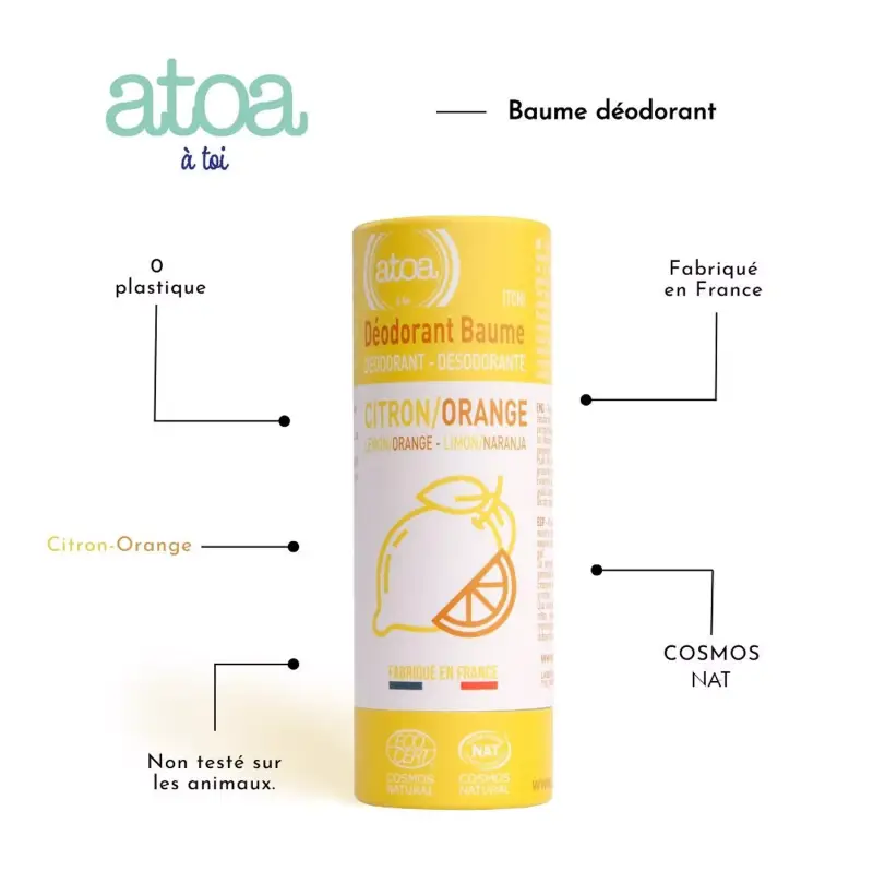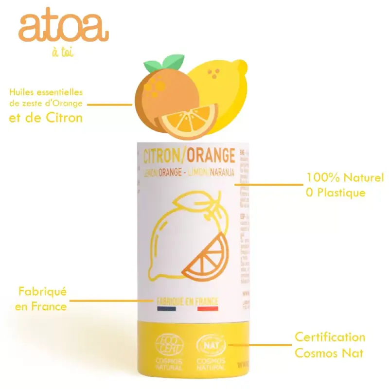 - Parfum Tonique Naturel : Ce déodorant utilise des huiles essentielles de zeste d’Orange douce et de zeste de Citron pour un parfum frais, lumineux et dynamisant dès l’application.