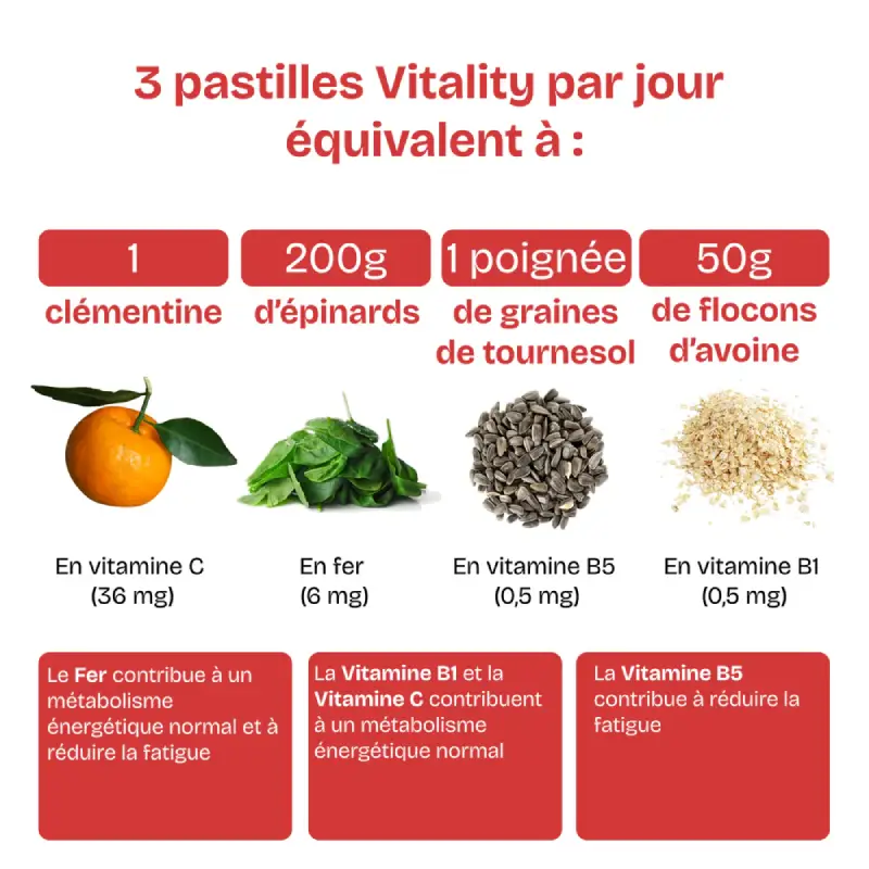 - Ingrédients Clés : Chaque bille contient des arômes naturels de fruits (Passion et Fraise), un mélange de vitamines, de minéraux, des colorants naturels (comme la betterave), et un super-aliment différent (propre à la formule Vitality).