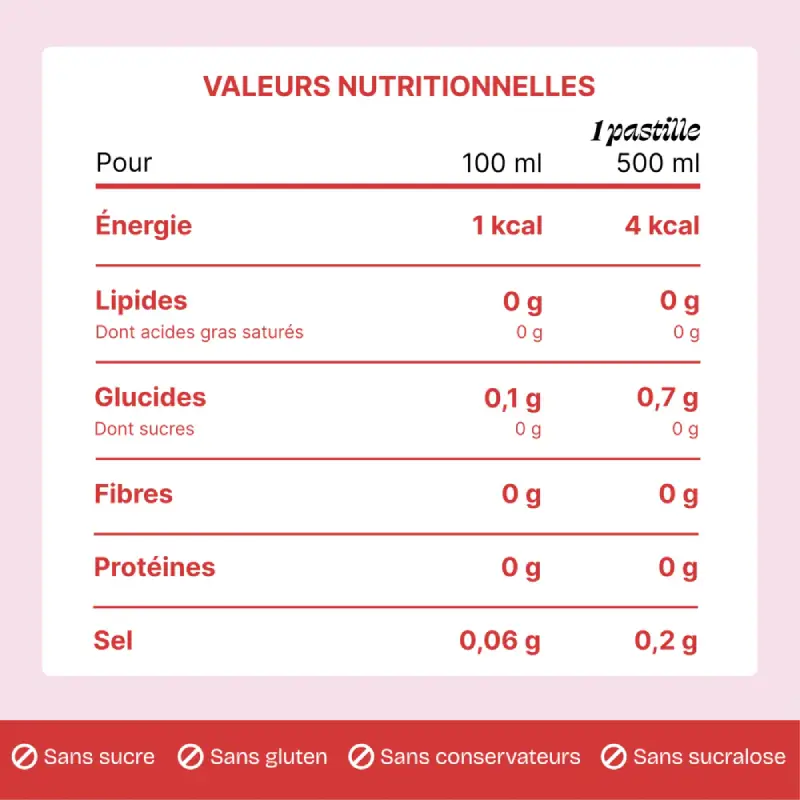 - Pureté : La formule est garantie sans sucre, sans calorie, sans additif nocif, sans conservateur, et sans gluten. Le produit est également 100% vegan.